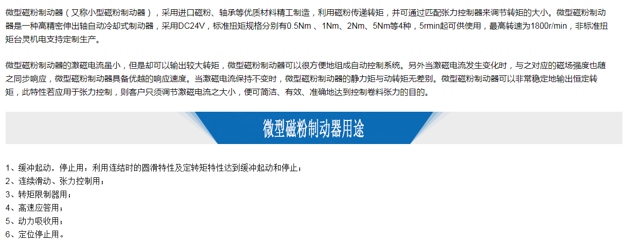 微型磁粉制動器(又稱小型磁粉制動器),采用進口磁粉、軸承等優(yōu)質(zhì)材料精工制造,利用磁粉傳遞轉(zhuǎn)矩,并可通過匹配張力控制器來調(diào)節(jié)轉(zhuǎn)矩的大小。微型磁粉制動器是一種高精密伸出軸自動冷卻式制動器,采用DC24V,標準扭矩規(guī)格分別有0.5Nm 、1Nm、2Nm、5Nm等4種,5rmin起可供使用,最高轉(zhuǎn)速為1800r/min,非標準扭矩臺靈機電支持定制生產(chǎn)。