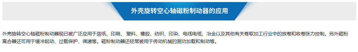 外殼旋轉空心軸磁粉制動器采用進口軸承、磁粉,環(huán)保無噪音,運轉相當?shù)陌察o平穩(wěn)、采用耐熱性高的進口磁粉,使用壽命長,并且熱容量比較大;散熱方式為自然冷卻式,空心軸聯(lián)結、止口支撐,外殼旋轉,旋轉外圍以提高散熱性能,提高了熱容量的機型,5r/min起可供使用。主要扭矩有主要有6nm、12nm、25nm、50nm、100nm、200nm、400nm等。更多更大的扭矩天機支持定制生產(chǎn)。