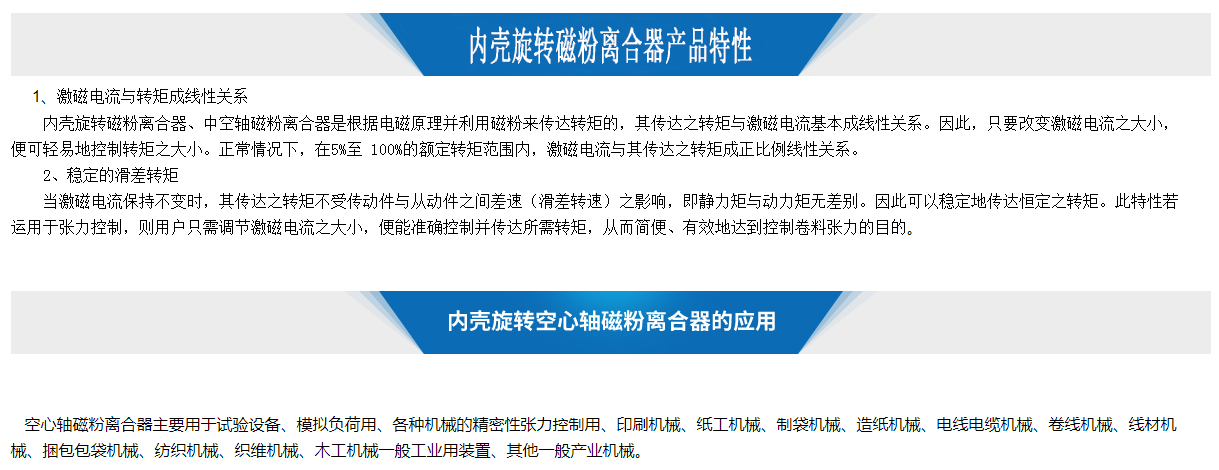 內(nèi)殼旋轉(zhuǎn)空心軸磁粉離合器采用耐高溫線圈超合金磁粉,使用壽命長(zhǎng),連接圓滑,無(wú)沖擊磁粉離合,磁粉純度高,不加黑色碳粉,性能穩(wěn)定,壽命長(zhǎng);CNC精密制造,精確度高,加工精細(xì),線性度好,性能優(yōu)越 。具有高線性,高精度轉(zhuǎn)矩控制;體積小,自重輕。安裝方便,使用壽命長(zhǎng)。是一種性能優(yōu)越的自動(dòng)控制元件。它以磁粉為工作介質(zhì),以激磁電流為控制手段,達(dá)到控制制動(dòng)或傳遞轉(zhuǎn)鉅的目的。其輸出轉(zhuǎn)鉅與激磁電流呈良好的線性關(guān)系而與轉(zhuǎn)速或滑差無(wú)關(guān),并具有響應(yīng)速度快結(jié)構(gòu)簡(jiǎn)單等優(yōu)點(diǎn)。