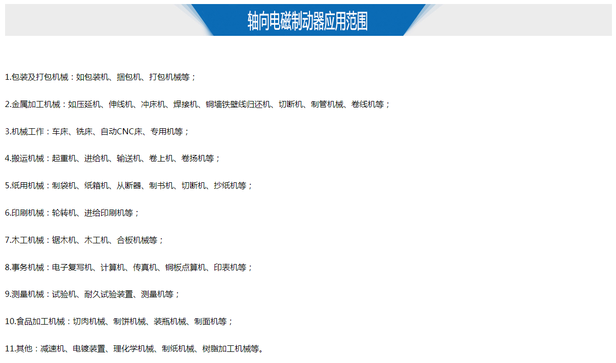 軸向電磁制動(dòng)器,它使用DC24V,由定子、板型彈片、銜鐵(電樞板)、磁性線圈、來令片、鋁導(dǎo)座等元件構(gòu)成,標(biāo)準(zhǔn)規(guī)格有0.6-40KG等等。(非標(biāo)規(guī)格可定制生產(chǎn))