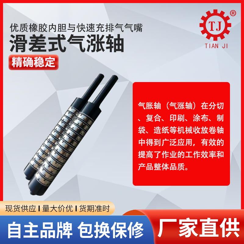氣脹軸氣漲軸主要由前套、后套、氣缸、內(nèi)管、氣囊、凸形鍵盤等部分組成,氣漲軸膨脹套由表面氧化的優(yōu)質(zhì)鋁制成,氣漲軸(氣脹軸)配有優(yōu)質(zhì)氣囊和快速充氣嘴。氣漲(氣脹軸)軸密封效果好,氣脹軸使用壽命長(zhǎng),氣脹軸維護(hù)方便。