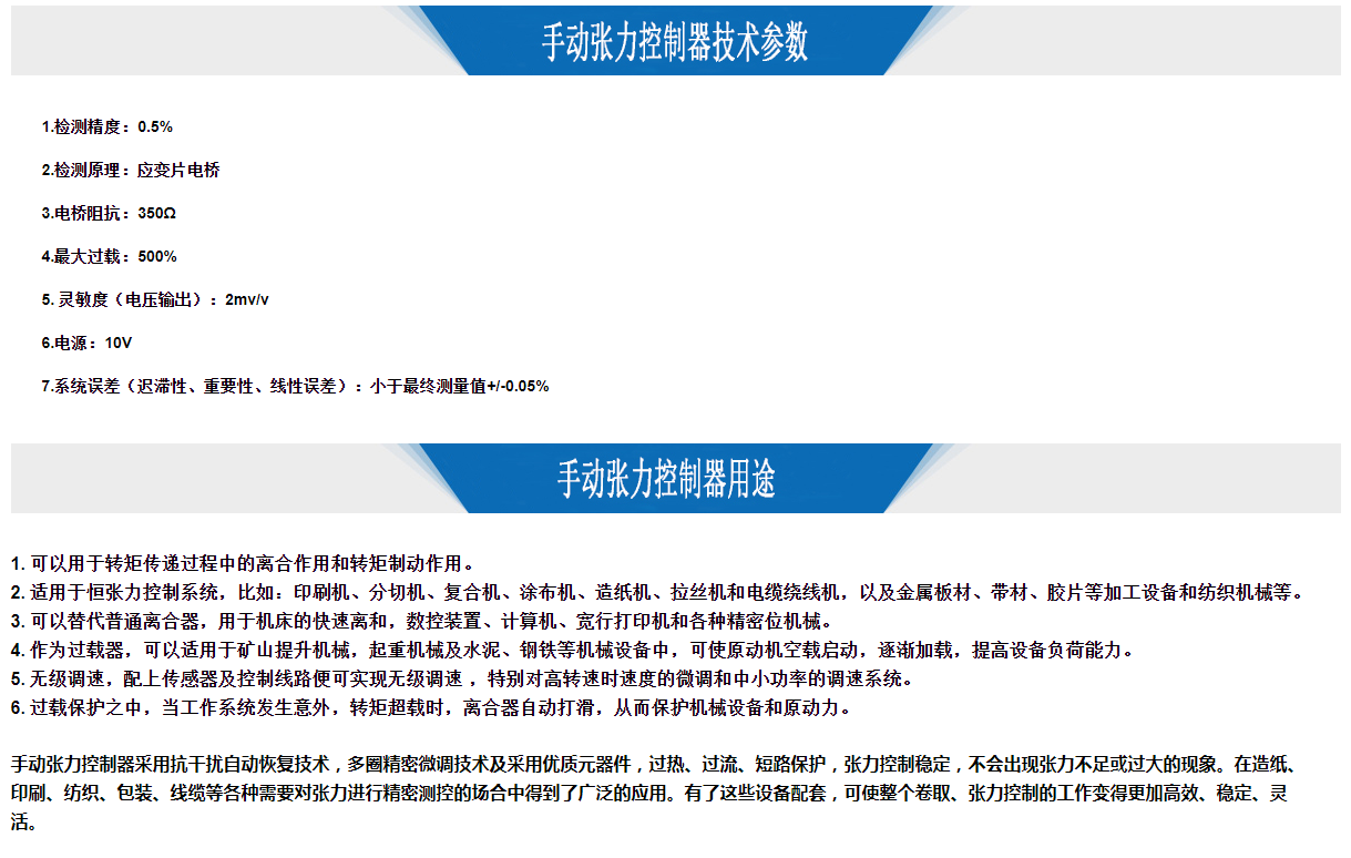 手動張力控制器是由操作人員手動調(diào)節(jié)控制器的輸出,供給磁粉制動器/磁粉離合器,以獲得所需的張力。其性能可靠,使用方便,保護(hù)措施嚴(yán)密。